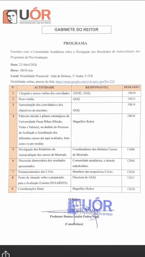 A Universidade Óscar Ribas vem por meio da presente convocar toda a Comunidade Acadêmica, Docentes, Investigadores, Egressos (estudantes que concluíram o seu ciclo de formação), bem como as entidades empregadoras que integraram no seu quadro profissionais formados por esta instituição para participarem deste encontro.